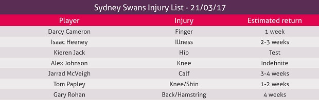So, is AJ not expected to return this year?The latest injury list is encouraging as most are not far off returning. At least Heeney now has a time frame and Papley could be ready for the 1st NEAFL game. Rohan said he is expecting to return to senior footy around round 8. If KJ is good to go, I think we can cover the rest. Heeney is the next one we need to get back playing. It would be nice if he's up and going for the Eagles game in round 4 followed by the Giants. Those will be a couple of very tough games back to back and we go to Perth coming off only a 6 day rest, but to be fair, WC only have a 5 day rest, but now travel. We have a few 2nd and 3rd year players, mainly Melican, Dawson, Newman and COL that seem ready for an AFL debut and this period may offer an opportunity for them to get a game or two.