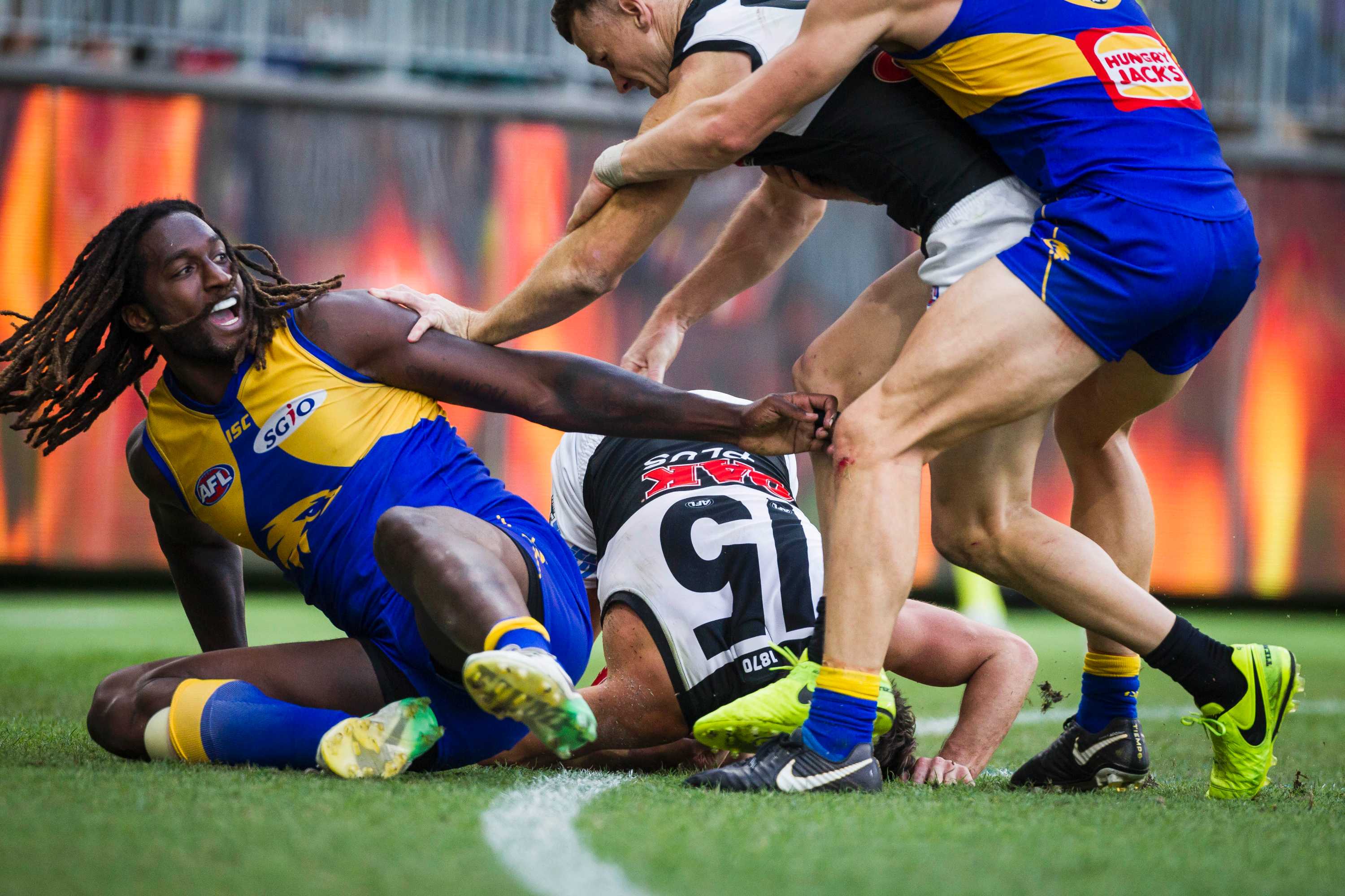 This is from a few years ago, and thus pre-dates the current tackle crackdown. Back then you probably were free to tackle (almost) how you wanted if there was no adverse effect on the player. But Amon was reported to have delayed concussion and Naitanui was suspended for a week.Comment